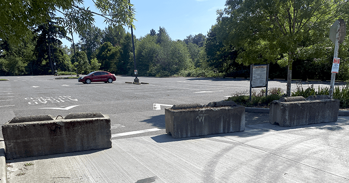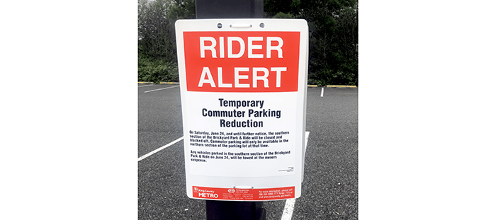 The park-and-ride is divided into two lots and prior to the pandemic, they were at near capacity on workdays. Since the pandemic, the lots are never more than ten percent full, and the back lot was often used for overnight stays and for dumping trash and human excrement. We wondered why they kept both lots open. Today there was this sign.