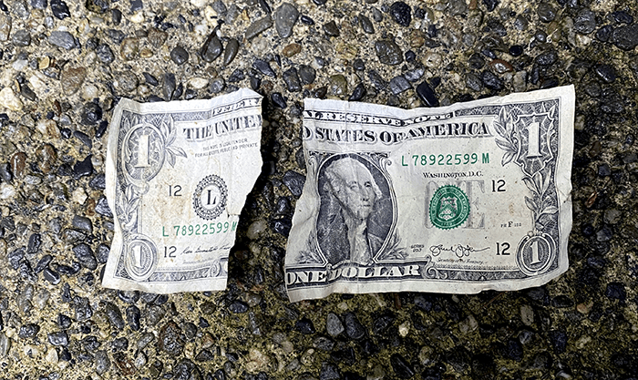 A little ironing, some tape, and it’ll be as good as new. We have found several torn dollar bills, but this is the first time we’ve found a matching half. Or third.