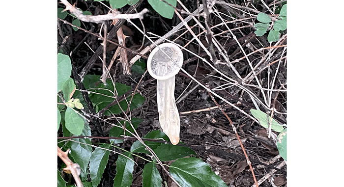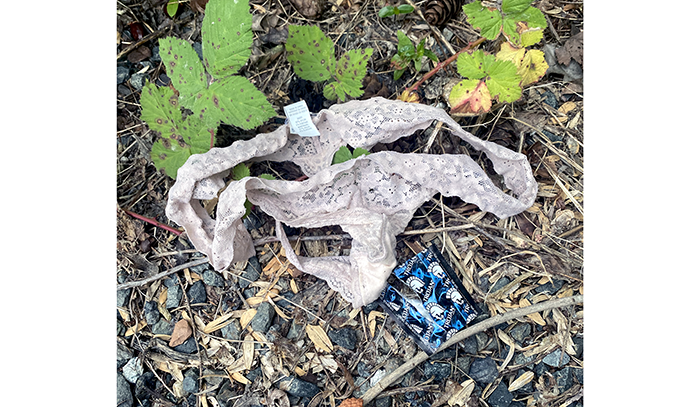A pair of panties and a condom wrapper. Then in a nearby bush.