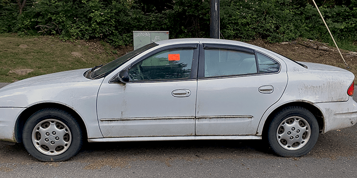 We note cars that appear to have been abandoned and often place a small rock on one of the tires to see if it has moved. This car has not moved for several months.