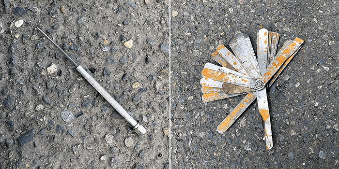 A nice 90-degree pick and a run over and rusty set of metric feeler guages. They both count as tools, but we don’t have much use for either, so you can take you’re pick depending on how you feel.