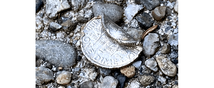 And it was bent. We have found a lot of broken and bent pennies, but this is the first dime we can recall. It looks like someone stopped on a dime. Literally and “litter-ally”.