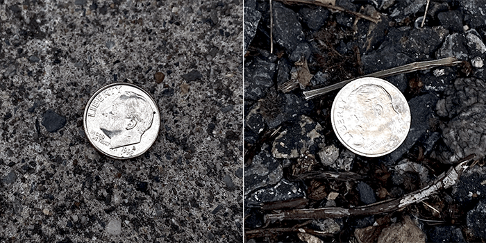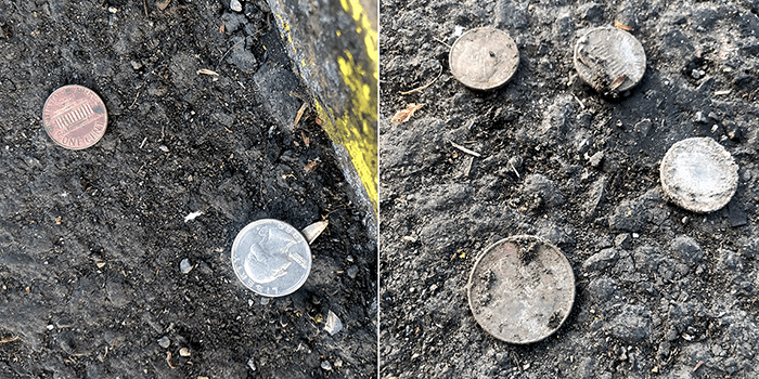 Two shiny dimes, one at the freeway onramp bus stop and the other at the recently closed off park-and-ride lot. But more about that later.