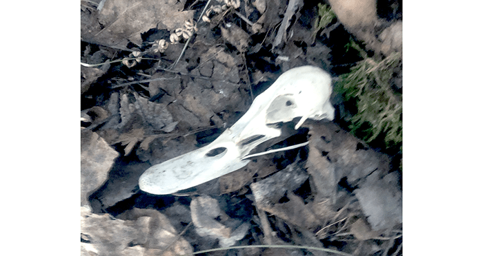 A duck’s skull. Checking our records, two years ago on May 4, 2021, we removed a roadkill duck from the street and placed it in the bushes. This could be that duck. And yes, it’s still a dead duck.