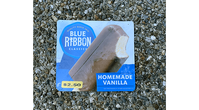 Better yet, the yellow sticker can be replaced with whatever we want. So we can purchase some of these bars change the sticker and resell them for $5.00 making a lot of money. But wait, the magnetic sign would fall off our vest and we would just end up picking it up again but with the melted ice cream we’ve been carrying.