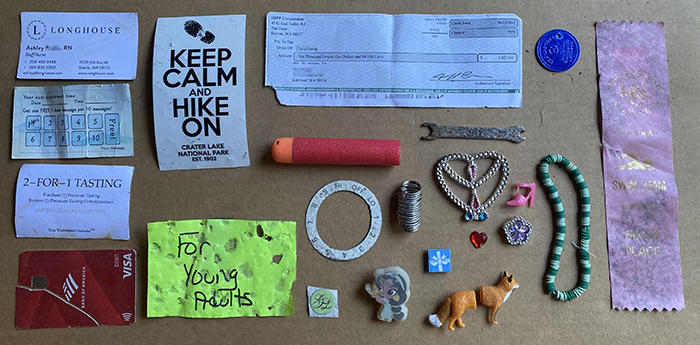 A “Keep Calm and Hike On” sticker from Crater Lake National Park and something for Young Adults, but probably not the hiking. Fortunately, no condoms were found in the vicinity.