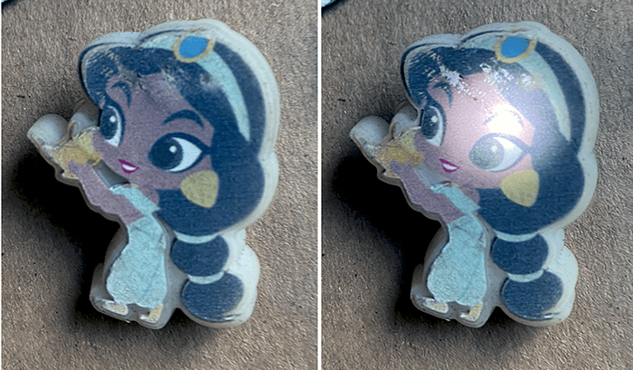 A sprung spring, an unknown “GH” label and Crocs Jibbitz Disney Jasmine shoe charm.