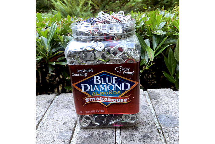 Pop tabs! As we collect beverage cans, we save the pop tabs and every six months or so, we weigh the pop tabs we’ve collected, wash and bag them up.