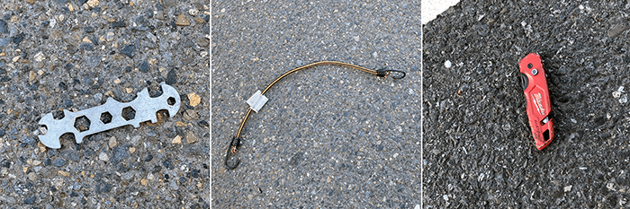 A bicycle repair wrench. We found it on eBay, and it was called a “Vintage New NOS Bicycle Bike Repair Wrench Multi Tool.” Okay, since it had “Vintage” in the title, it must be worth the twelve-dollar asking price. In the middle, a pristine bungee cord and on the right a nice Milwaukee utility knife, thirteen dollars at Home Depot.