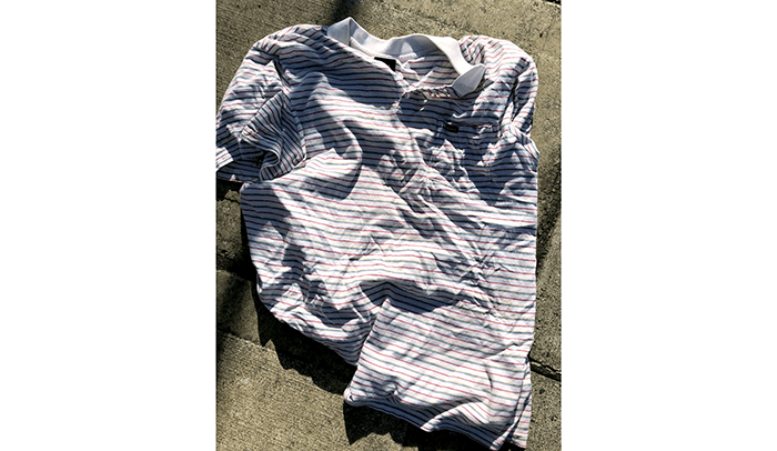 At the park-and-ride, a red, white, and blue striped polo shirt.