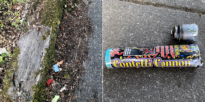Plus, the Litter Cannon it came from. We are sure this is from the “Party for Less” near Safeway. If it happens again, we will purchase a cannon and set it off in their store. See how they like it.