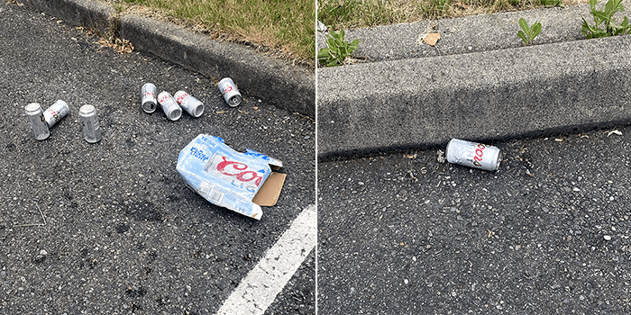 Now onto the park-and-ride. As we mentioned, they closed off about half of the parking areas because it was being use as a dump and party location. In the open part of the park-and-ride, someone had a beer party. Scattered around the top part of the lot were part of a 12-pack of Coors Light.
