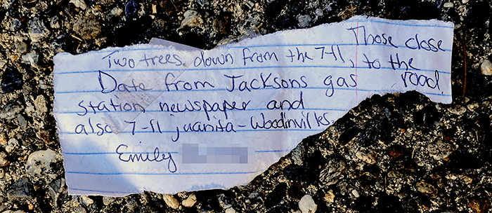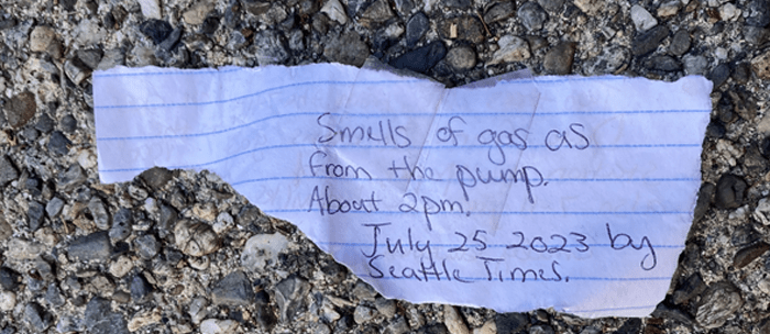 Sorry, Emily. We have read these several times and cannot parse it. We understand there is a smell of gas, and we know the 7Eleven on Juanita-Woodinville Way as well as the Jackson’s Station, about a mile away. But we don’t understand the Seattle Times newspaper reference or exactly where the gas was detected. More mysteries of TrashWalking.