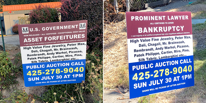 We’ve found these a few times before, but they are normally yellow. Guess they are making enough money to afford multiple colors. The one on the left was found on our walk. The one on the right was spotted later while we were running some errands. At least get your story straight, is it a government auction or a bankruptcy? We should get some stickers to paste over the telephone number. The sticker will have the number of the Washington State Fraud hotline. The statement on the bottom is new, though. Do you think that will happen? We’ll bet you the next three pennies we find and a roadkill of your choice if they do.
