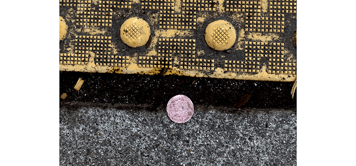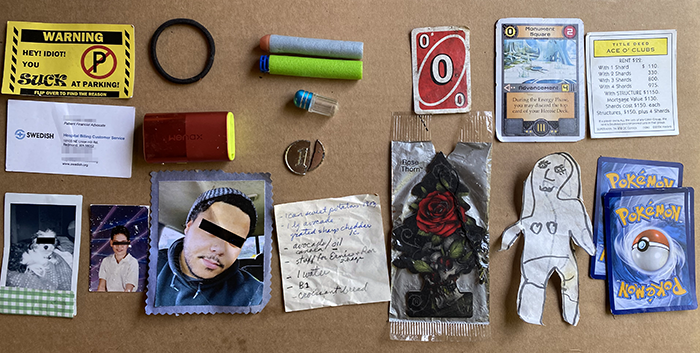 Starting at the top, a bad-parking card, and no, it wasn’t left for us. A business card for a hospital Patient Financial Advocate and three photos, a dog, a kid, and a young man. Of course, we blanked out their eyes to protect their identities. Yet another hair band, some Nerf bullets, and a small vial. We have found a few of these bottles before but we have yet to find what they are for.