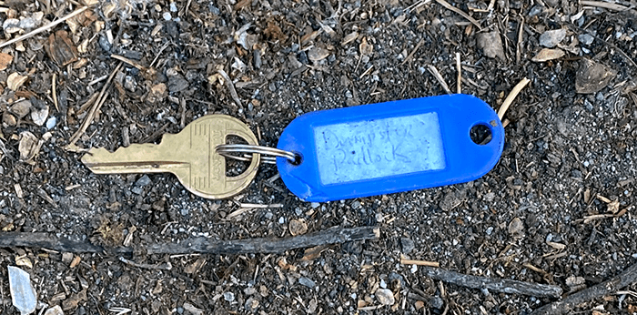 The tag says, “dumpster padlock.” We could use another place to dump garbage on our walks, but we don’t know where this dumpster is. Perhaps we will carry it with us and try all the locked dumpsters we happen on.