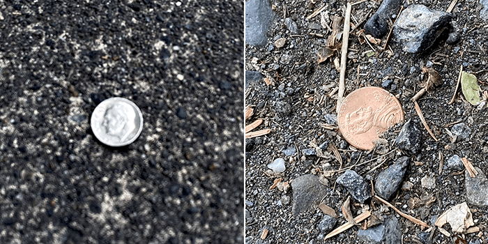 Both were found near the end of our walk. As Chuck was passing the entrance to the park-and-ride, he saw a cup across Juanita-Woodinville Way and, with no traffic coming crossed to pick it up. Coming back across, he made it to the island at the turn-in to the park-and-ride and waited for a break in traffic. Suddenly, the cars stopped. That was nice of them, but then he noticed a car turning into the park-and-ride had triggered the traffic light and took the opportunity to cross the lanes. About half-way through the last lane, he noticed the dime and tried to make a walking-pickup with the pickers, but it was stuck to the tar. Chuck again waited for a break in traffic and pried the dime loose. It’s a good thing the car didn’t stop on the dime. The penny was just lying in the gutter along 112th Ave. NE.