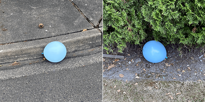 As we passed through one block, we found some balloons and pieces of popped balloons. In all we found five inflated balloons and two popped balloons. Unfortunately, the balloons popped when they accidently brushed up against some berry bushes. Come on, we couldn’t very well carry them and if we left them, we would be picking up the pieces on Monday.