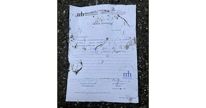 It’s from the Manarom Hospital in Bangkok dated 19 June 2023. It states that a psychiatrist treated a girl with Ritalin for ADD. It’s probably a declaration that the drugs are prescribed to allow travel to the U.S. It must have worked because they tossed the certificate here.
