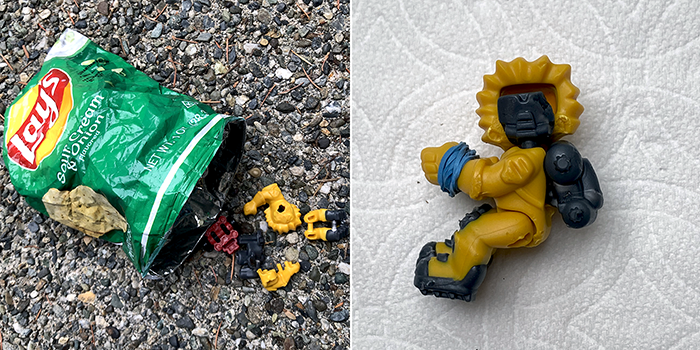 It had been run over but we were able to piece it together. No, we are not into bondage, the rubber band is holding it together. It is a Kinder Joy: Ice Climber and we found it on eBay for $4.50 plus $4.00 shipping. We’ll let this go for $4.00 and we’ll pay shipping, rubber band included. Some assembly required.