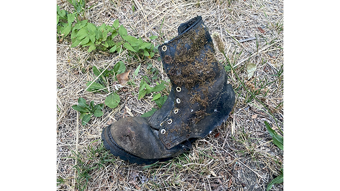 It may have been there a while. Unfortunately, we couldn’t find the other one, because Goodwill only accepts matching pairs of shoes. As it was, we gave our garbage can the boot.