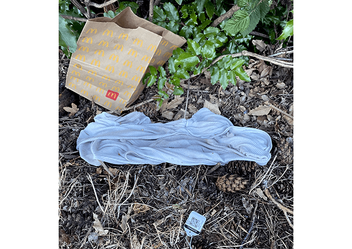 At the bus stop across from Safeway, McDonalds trash, a shirt and a Goodwill price tag.