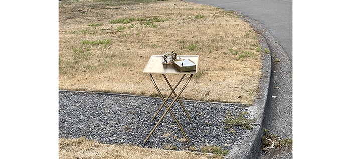 A pixie-house teapot with a couple of pixies next to it. A shoebox with a miniature cup and broken saucer and a couple of other items. We don’t know if these are free or they are holding a mini garage sale.