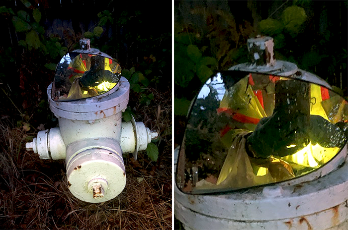 “Mirror, mirror on the hydrant, who’s the fairest dog to flaunt it?” Janet did her best to get a selfie. Nice vest, though.