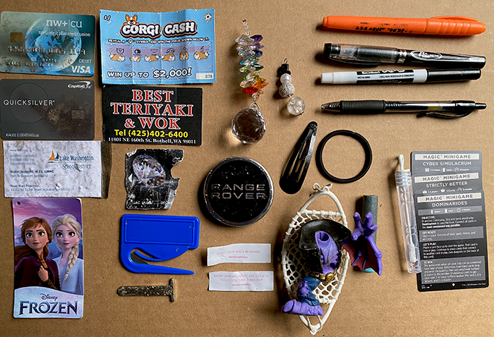 Starting on the left with the cards, two of Kaylee’s unexpired credit cards found on the freeway onramp. We shredded them. A business card for a Lake Washington School District Family Support Specialist. In our day the closest thing we had to this was the Dean notifying the family that Chuck got sent to the Principal’s Office. Again.