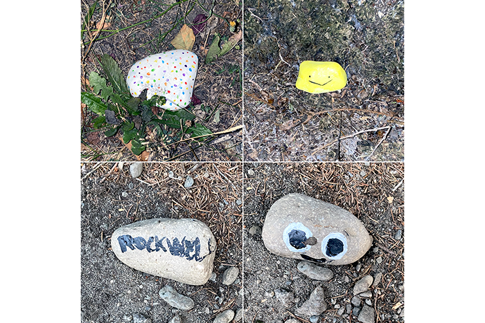 We turned the yellow one over, so it was frowning. It shouldn’t be so happy with today’s air quality. The bottom two pics are two sides of the same rock. We left Rockwall staring into space. Usually, these stones have instructions on them to take them, keep, or hide them again. But there was nothing, so we were left between a rock and a hard spot, which in this case could have been another rock.
