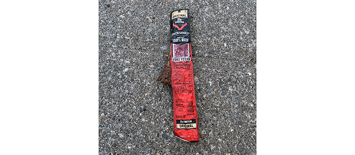 Well, it was opened, but only by being runover by the traffic, but it was uneaten. Well, that’s not quite true, ants were all over it, but they took very small bites. We emptied the beef sticks into the weeds for the ants and took the wrapper. We may have ended up with a few ants in our bag, but it’s every ant for itself.