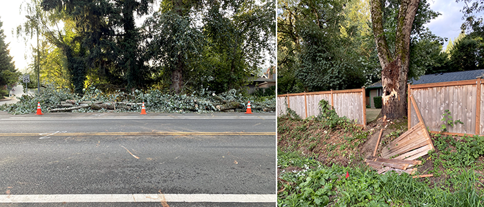 A huge branch broke off a tree yesterday on Juanita-Woodinville Way at about 10:00 am. There was no wind to speak of, it just fell. We walked by this spot about 5:40 am. So, if a tree falls on Chuck and Janet and nobody else is around, does it make a sound? We don’t know, but we sure would.