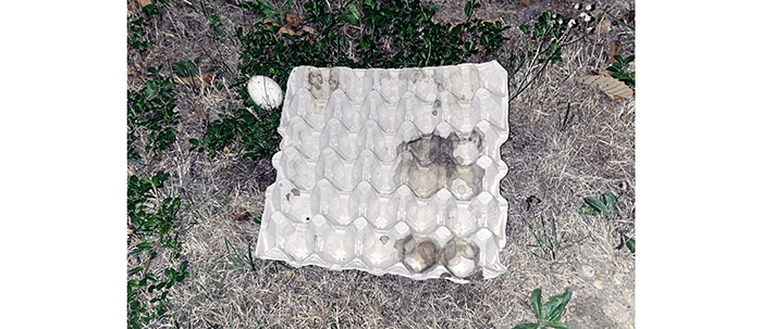But only one egg was found, and it was unbroken. We expected to find other egg remains along our route but found nothing. Perhaps someone who raises chickens, counted his eggs before they hatched, purchased the tray, and was disappointed. If so, we assume he invited his chickens to a nice southern-fried dinner, including a custard dessert for one.