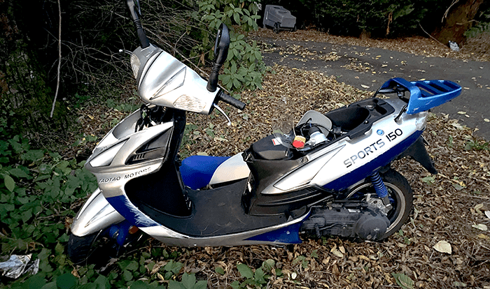 There were parts scattered for about thirty feet before we reached the cycle. We left the bulk of the parts until the scooter gets towed. Interestingly, there is some deodorant on top. The guy probably needed to freshen up after his fall. We didn’t see an extra change of underwear, though.