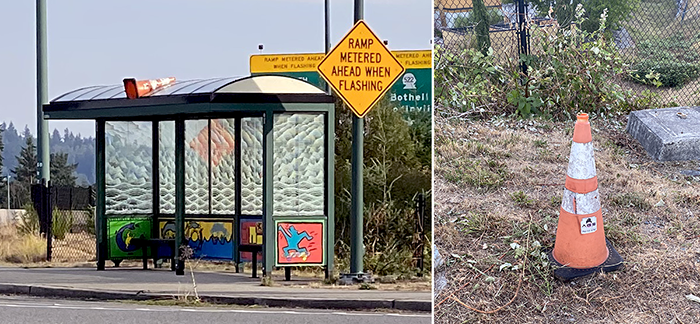 At the northbound freeway on-ramp, we saw that someone tossed a traffic cone atop the bus stop shelter.