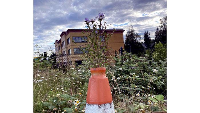 The abandoned traffic cone had been in place for several years and we took photos of it each year with new flowers growing out of the top of it.