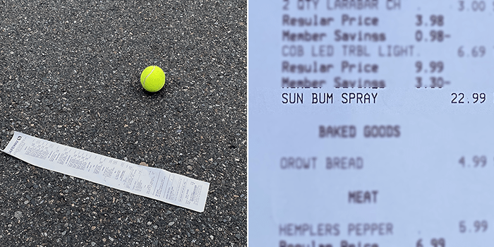 Curiously, there were no entries for a tennis ball, but one item caught our eye, “Sun Bum Spray.” That’s a very targeted sunscreen lotion. We can’t bare butt see it.