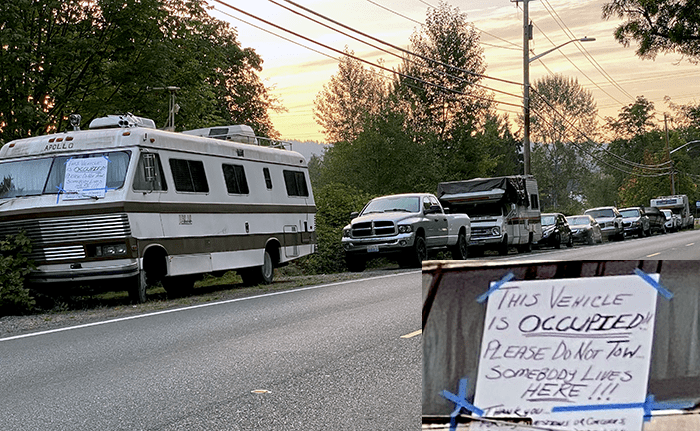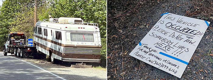 Speaking of illegal encampments, last week we talked about the RV’s along Woodinville Drive and one had a new sign. The sign stated to not tow because someone lived there, which is illegal. This week, a friend sent me a photo he took of the RV being towed.