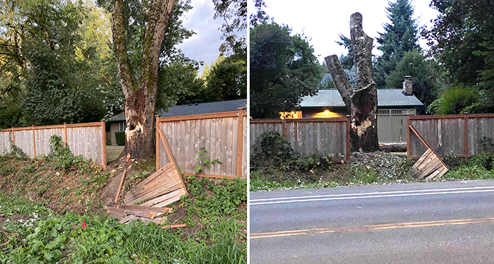 This morning we noticed the owners decided to remove the other branches that were leaning toward their house after seeing what the one did to their fence.
