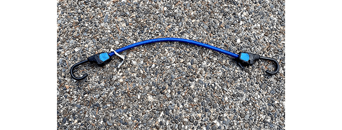 A bungee cord in relatively good condition. If anybody needs bungee cords or tie-down straps, let us know. We have an abundance of them, some not run over at all.