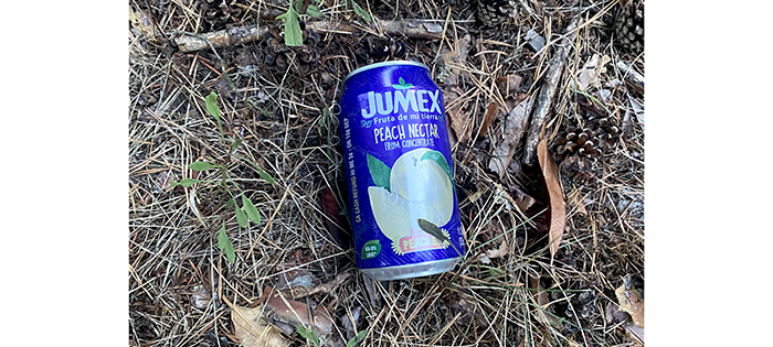 An unopened can of Jumex Peach Nectar (from concentrate). This means that the peach juice was extracted, filtered, evaporated, and stored. Then, water is added back, and the juice is canned. So why don’t they just sell a small can of the concentrate and let the consumer add water and shake. It would be much easier for us to carry.