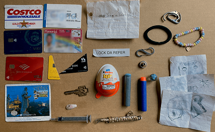 On the right, some jewelry, a hair band, an S-Biner and some kid’s doodles. There was also a Kinder Joy “Sweet Cream Topped with Cocoa Wafer Bites” and a “Surprise Toy Inside.” Someone ate the candy but left the toy untouched.