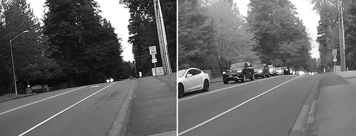 On the left is a view along 145th Ave NE on Thursday August 10th of this year. On the right is the traffic today at about the same time.