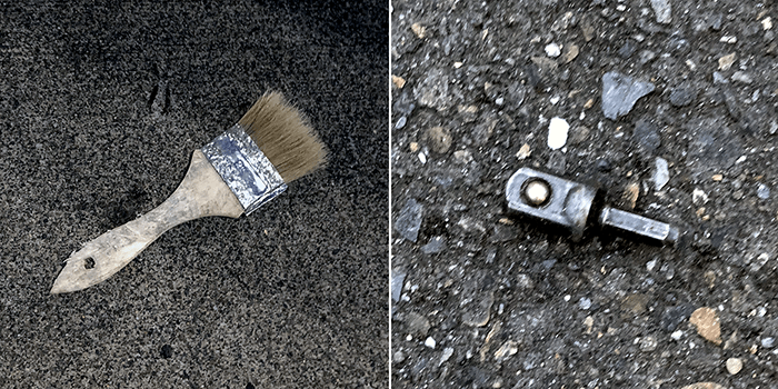A paint brush that has been well-used and well-run-over and a drill socket adapter for a half-inch socket. The drill adapter had been broken where the shank narrows, but it’s still usable. We were not able to find a straight answer for why the shank is narrow at one point.