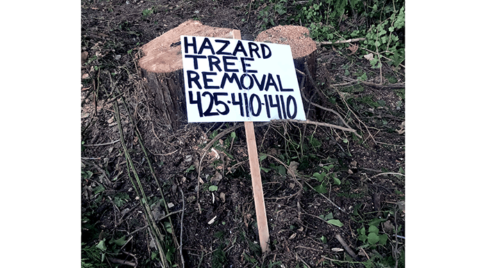 What does this sign mean? There’s a hazard here due to tree removal? Or hazardous trees are being removed? It turns out that the company name is Hazard Tree Removal and they specialize in removing hazardous trees. We think they should consider more professional signage, though.