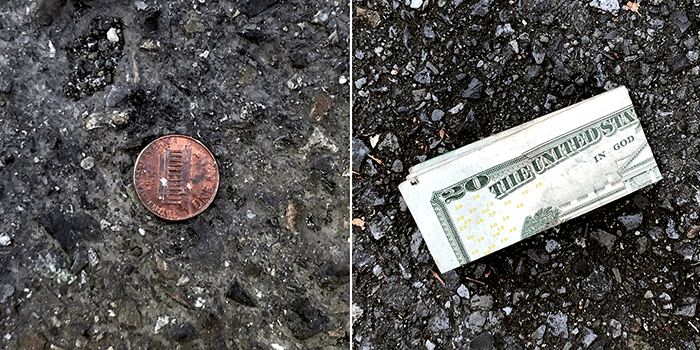 Another nice TrashWalking day, though the traffic was heavier. We didn’t see any roadkill and found more money spread along our route.