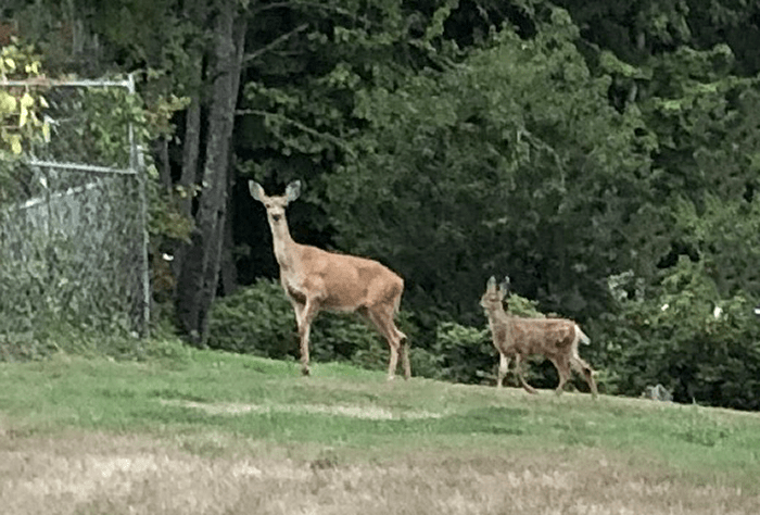 As we crested Norway Hill, we saw a doe and her baby staring at us. We stopped and stared back. A few minutes passed without either of us moving. Then we thought, are deer carnivorous and are they hungry? We decided to move on.
