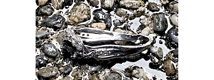 A smashed one. It looked like an engagement ring with the diamond missing. However, when we examined it later, it looks to be silver-plated copper. We’ll put it in our found jewelry collection anyway.