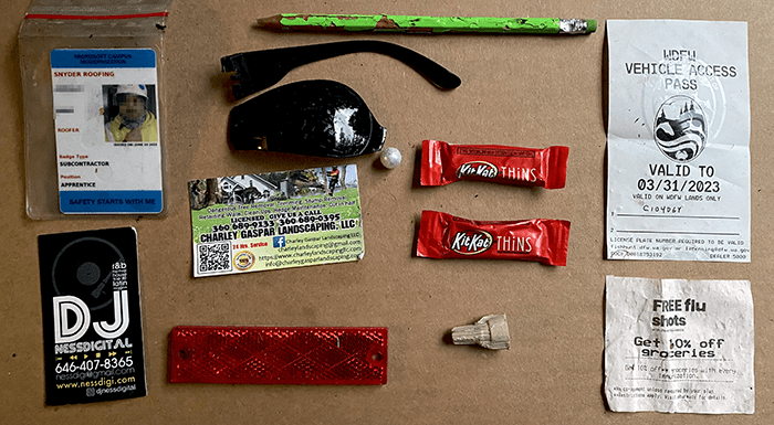 An ID for a roofer lost in the park-and-ride showing he is a worker on a Microsoft campus project and a business card for a DJ out of Atlanta. A runover pencil and eyewear, a fake pearl, two KitKat bars, unopened, a lost reflector and a crushed wire nut. Then, an expired Washington Department of Fish and Wildlife vehicle pass and a receipt with an offer of free flu shots plus ten percent off groceries.