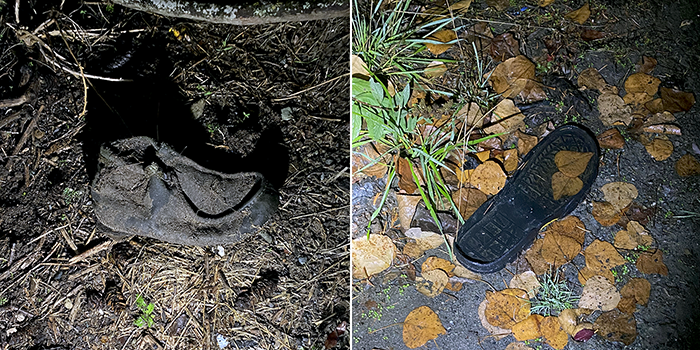 On the left was a complete shoe that had been buried in the ditch. The recent rains must have exposed the shoe, and we pulled it out. The one on the right was found by the side of the road and was definitely new since last week. Neither will be going to Goodwill.